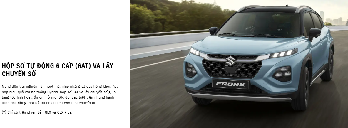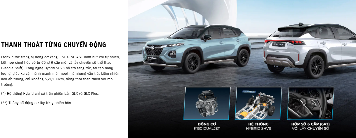 Mạnh mẽ mà thanh lịch – Fronx mang đến trải nghiệm lái khác biệt với thiết kế coupe năng động, động cơ K15C kết hợp hệ thống Hybrid SHVS, hộp số tự động 6 cấp 6AT cùng hệ thống ADAS – công nghệ hỗ trợ lái tiên tiến, giúp bạn tận hưởng sự khác biệt trong từng chuyển động.